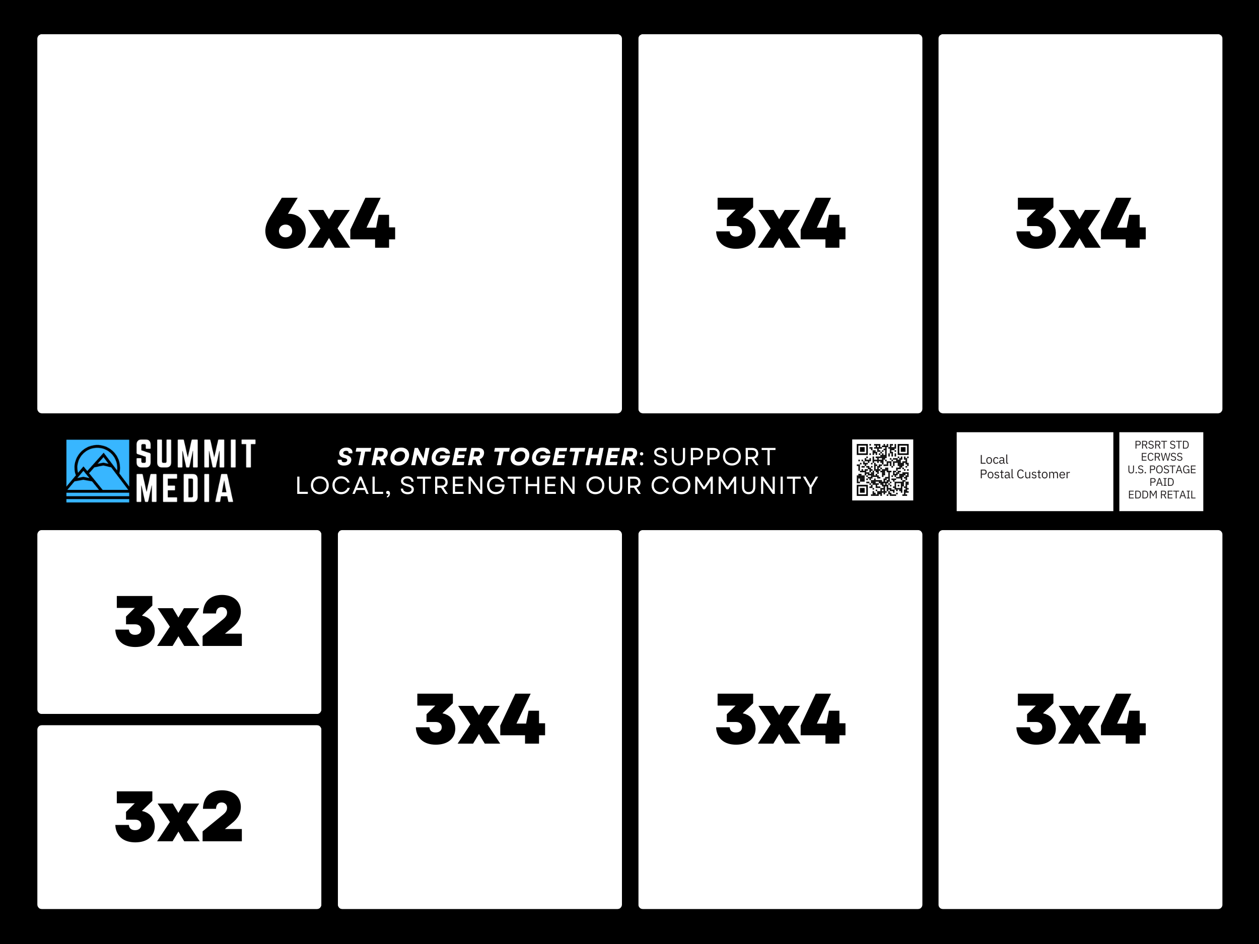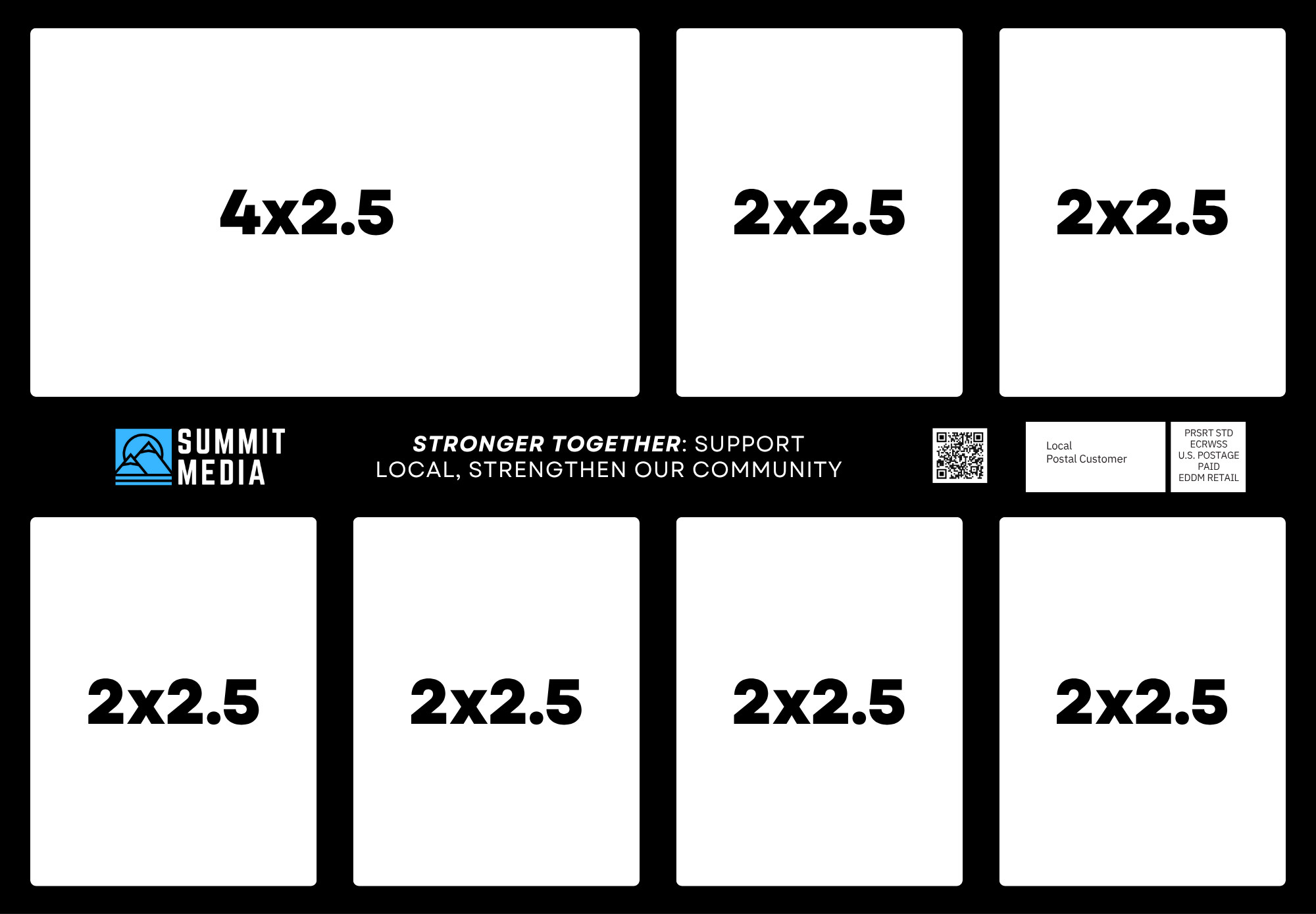We print a jumbo 9x12 postcard and feature multiple local businesses on it. Because the space is shared, each business pays only a fraction of what a solo postcard mailing would cost. The card is then mailed directly to 10,000 local households—putting your business in front of the entire community.
